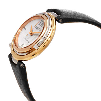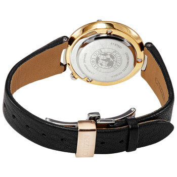 Gold-tone stainless steel case with a black leather strap. Fixed double gold-tone bezel with a silver-tone ring set with a single diamond. White dial with gold-tone hands. A Roman numeral appears at the 12 o'clock position. Index markers at the 3, 6 and 9 o'clock positions. Dial Type: Analog. Citizen Caliber E031 eco-drive movement. Scratch resistant sapphire crystal. Pull / push crown. Solid case back. Round case shape. Case size: 32.2 mm. Case thickness: 8 mm. Band width: 12 mm. Fold over clasp. Water resistant at 50 meters / 165 feet. Functions: hour, minute, second. Dress watch style. Citizen Diamond White Dial Black Leather Ladies Watch EM0656-15A.