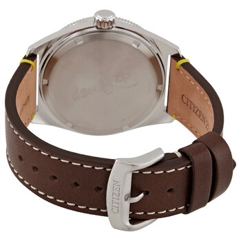 Stainless steel case with a brown leather strap. Fixed stainless steel bezel with an inlaid blue ring. Blue dial with luminous silver-tone hands and index hour markers. An Arabic numeral appears at the 12 o'clock position. Minute markers around the outer rim. Dial Type: Analog. Luminescent hands and markers. Date display at the 3 o'clock position. Citizen caliber J810 eco-drive movement. Scratch resistant mineral crystal. Pull / push crown. Solid case back. Round case shape. Case size: 43 mm. Case thickness: 10 mm. Band width: 24 mm. Tang clasp. Water resistant at 100 meters / 330 feet. Functions: date, hour, minute, second, solar-powered. Mickey Mouse Series. Casual watch style. Watch label: Japan Movt. Citizen Disney Classic Blue Dial Men's Watch AW1599-00W.