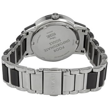 Stainless steel case with a stainless steel bracelet with black ceramic links. Fixed stainless steel bezel with a black ceramic ring. Black dial with luminous silver-tone hands and index hour markers. Diamond markers appear at the 3, 6, 9 and 12 o'clock position. Minute markers around the outer rim. Dial Type: Analog. Luminescent hands. Citizen caliber Eco-Drive E031 eco-drive movement. Scratch resistant mineral crystal. Pull / push crown. Solid case back. Round case shape. Case size: 36 mm. Case thickness: 9.1 mm. Band width: 19 mm. Deployment clasp with a push button release. Water resistant at 100 meters / 330 feet. Functions: hour, minute, second, solar-powered. Disney Villains Ursala Series. Dress watch style. Watch label: Japan Movt. Citizen Disney Villains Ursala Diamond Black Dial Ladies Watch EM0748-51W.