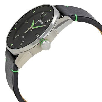 Stainless steel case with a black leather strap. Fixed stainless steel bezel. Black dial with silver-tone hands and index hour markers. Dial Type: Analog. Luminescent hands. Date display at the 3 o'clock position. Quartz movement. Scratch resistant mineral crystal. Screw down crown. Solid case back. Case size: 42 mm. Case thickness: 10 mm. Round case shape. Band width: 22 mm. Tang clasp. Water resistant at 100 meters / 330 feet. Functions: date, hour, minute, second. Casual watch style. Citizen Drive Black Dial Eco-Drive Men's Watch BM6980-08E.