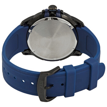 Black-plated stainless steel case with a blue polyurethane strap. Fixed black-plated bezel. Black dial with luminous blue hands and index hour markers. Arabic numerals appear at the 6 and 12 o'clock positions. Minute markers around the outer rim. Dial Type: Analog. Luminescent hands and markers. Date display at the 3 o'clock position. Citizen caliber J810 eco-drive movement. Scratch resistant mineral crystal. Screw down crown. Solid case back. Round case shape. Case size: 45 mm. Tang clasp. Water resistant at 100 meters / 330 feet. Functions: date, hour, minute, second. Drive Series. Casual watch style. Citizen Drive Black Dial Men's Watch AW1655-01E.