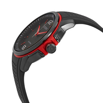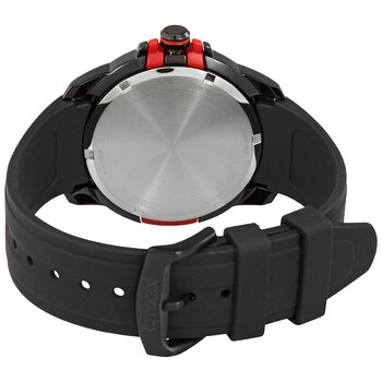 Black-plated stainless steel case with a black polyurethane strap. Fixed black-plated bezel. Black dial with luminous red hands and index hour markers. Arabic numeral markers at the 6 and 12 o'clock positions. Minute markers around the outer rim. Dial Type: Analog. Luminescent hands. Date display at the 3 o'clock position. Citizen caliber Eco-Drive J810 eco-drive movement. Scratch resistant mineral crystal. Solid case back. Round case shape. Case size: 45 mm. Case thickness: 11.2 mm. Band width: 23 mm. Tang clasp. Water resistant at 100 meters / 330 feet. Functions: date, hour, minute, second, solar-powered. Drive Series. Sport watch style. Watch label: Japan Movt. Citizen Drive Black Dial Men's Watch AW1658-02E.