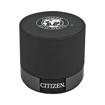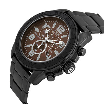 Black ion-plated stainless steel case and bracelet. Fixed black ion-plated bezel. Brown dial with skeleton hands and alternating Arabic numeral and index hour markers. Minute markers around the outer rim. Dial Type: Analog. Luminescent hands and markers. Date display at the 4 o'clock position. Chronograph - three sub-dials displaying: 60 second, 60 minute and 24 hour. Eco drive quartz movement. Scratch resistant mineral crystal. Solid case back. Case diameter: 48 mm. Case thickness: 11 mm. Round case shape. Band width: 23 mm. Deployment clasp. Water resistant at 100 meters / 330 feet. Functions: chronograph, date, hour, minute, second. Luxury watch style. Watch label: Swiss Made. Citizen Drive Brown Dial Chronograph Black IP Stainless Steel Men's Watch AT2275-56X.