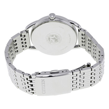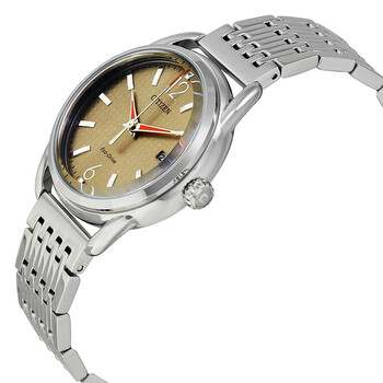 Stainless steel case with a stainless steel bracelet. Fixed stainless steel bezel. Brown dial with luminous silver-tone hands and index hour markers. Arabic numerals mark the 6 and 12 o'clock positions. Minute markers around the outer rim. Dial Type: Analog. Luminescent hands and markers. Date display at the 3 o'clock position. Quartz movement. Scratch resistant mineral crystal. Pull / push crown. Solid case back. Case size: 34 mm. Case thickness: 9 mm. Round case shape. Band width: 17 mm. Fold over clasp with a safety release. Water resistant at 30 meters / 100 feet. Functions: date, hour, minute, second. Additional Info: in general, withstands splashes or brief immersion in water, but not suitable for swimming or bathing. Casual watch style. Citizen Drive Brown Dial Ladies Watch FE6080-54X.