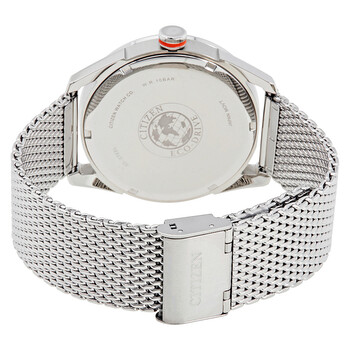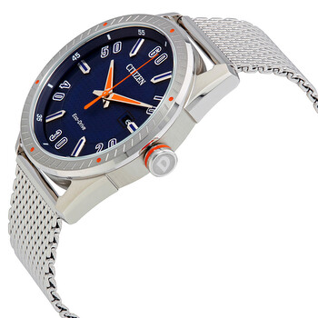 Stainless steel case with a stainless steel mesh bracelet. Fixed stainless steel bezel. Blue dial with luminous silver-tone hands and index hour markers. Arabic numeral minute markers (at 5 minute intervals). Dial Type: Analog. Luminescent hands and markers. Date display at the 3 o'clock position. Citizen Caliber Eco-Drive E111 eco-drive movement. Scratch resistant mineral crystal. Pull / push crown. Solid case back. Case size: 42 mm. Case thickness: 10 mm. Round case shape. Band width: 22 mm. Band length: 8 inches. Box clasp. Water resistant at 100 meters / 330 feet. Functions: date, hour, minute, second. Casual watch style. Watch label: Japan Movt. Citizen Drive Eco Drive Blue Dial Men's Watch BM6990-55L.