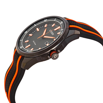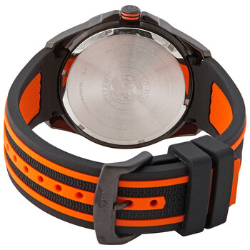 Black ion-plated stainless steel case with a black (orange stripe) rubber strap. Fixed black ion-plated bezel. Black dial with luminous orange hands and index hour markers. Minute markers around the outer rim. Dial Type: Analog. Luminescent hands and markers. Date display at the 3 o'clock position. Citizen caliber Eco-Drive J810 quartz movement. Scratch resistant mineral crystal. Screw down crown. Solid case back. Round case shape. Case size: 45 mm. Case thickness: 14 mm. Band width: 20 mm. Tang clasp. Water resistant at 100 meters / 330 feet. Functions: date, hour, minute, second. Additional Info: Eco-drive technology – powered by light, any light. never replace another watch battery. Sport watch style. Watch label: Japan Movt. Citizen Drive Quartz Black Dial Black Rubber Men's Watch AW1608-01E.