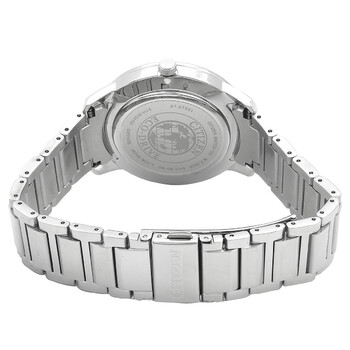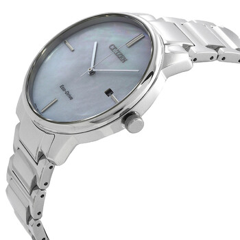 Silver-tone stainless steel case and bracelet. Fixed silver-tone stainless steel bezel. Mother of pearl dial with silver-tone hands and index markers at the 3,6,9 and 12 o' clock positions hour markers. Dial Type: Analog. Date display at the 3 o'clock position. Citizen Caliber Eco-Drive E111 eco-drive movement. Scratch resistant sapphire crystal. Solid case back. Round case shape, case size: 39.2 mm, case thickness: 9.5 mm. Deployment with push button release clasp. Water resistant at 50 meters / 165 feet. Functions: date, hour, minute, second, solar-powered. Eco Drive 180 Series. Dress watch style. Watch label: Japan Movt. Citizen Eco Drive 180 Men's Watch BM7520-88D.