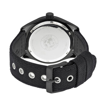 Black PVD stainless steel case with a black nylon bracelet. Fixed black PVD bezel. Black and yellow dial with yellow-toned hands and Arabic hour markers. Minute markers around the outer rim. Dial Type: Analog. Date display at the 3 o'clock position. Small seconds sub-dial at the 6 o'clock position. Quartz movement. Scratch resistant mineral crystal. Solid case back. Case diameter: 43 mm. Case thickness: 12 mm. Round case shape. Tang clasp. Water resistant at 100 meters / 330 feet. Functions: date, hour, minute, second. Casual watch style. Citizen Eco Drive Black and Yellow Dial Black Nylon Strap Men's Watch BV1085-14E.