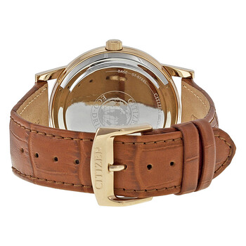 Rose gold-tone stainless steel case with a brown leather strap. Fixed rose gold-tone bezel. Black dial with rose gold-tone hands and Arabic numeral hour markers. Minute markers around the outer rim. Dial Type: Analog. Two sub-dials displaying: day of the week and date. Eco-Drive 8635 eco-drive movement. Scratch resistant mineral crystal. Pull / push crown. Solid case back. Case size: 42 mm. Case thickness: 11 mm. Round case shape. Band width: 22 mm. Band length: 9 inches. Tang clasp. Water resistant at 30 meters / 100 feet. Functions: date, day, hour, minute, second. Casual watch style. Watch label: Japan Movt. Item Variations: AO9003 08E, AO9003.08E, AO900308E. Citizen Eco Drive Black Dial Brown Leather Men's Watch AO9003-08E.