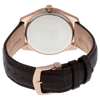 Rose gold-tone stainless steel case with a brown leather strap. Fixed rose gold-tone bezel. Black dial with luminous rose gold-tone hands and index hour markers. Minute markers around the outer rim. Dial Type: Analog. Luminescent hands and markers. Date display at the 3 o'clock position. Eco drive quartz movement. Scratch resistant mineral crystal. Pull / push crown. Solid case back. Case diameter: 40 mm. Case thickness: 9 mm. Round case shape. Band width: 20 mm. Tang clasp. Water resistant at 30 meters / 100 feet. Functions: date, hour, minute. Casual watch style. Watch label: Japan Movt. Citizen Eco Drive Black Dial Brown Leather Men's Watch AU1043-00E.