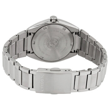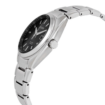 Grey (super) titanium case and bracelet. Fixed grey (super) titanium bezel. Black dial with luminous silver-tone hands and index hour markers. Arabic numeral minute markers (at 5 minute intervals). Minute markers around the outer rim. Dial Type: Analog. Luminescent hands. Date display at the 3 o'clock position. Citizen caliber E011 eco-drive movement with a 180-day power reserve. Scratch resistant sapphire crystal. Pull / push crown. Solid case back. Round case shape. Case size: 34 mm. Case thickness: 9 mm. Band width: 16 mm. Fold over clasp with a push button release. Water resistant at 100 meters / 330 feet. Functions: date, hour, minute, second. Eco Drive Series. Casual watch style. Watch label: Japan Movt. Citizen Eco Drive Black Dial Titanium Ladies Watch EW2210-53E.