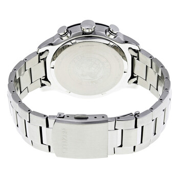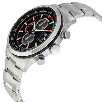 Stainless steel case with a stainless steel bracelet. Fixed stainless steel bezel. Black dial with luminous orange hands and index hour markers. Minute markers. Tachymeter markings around the outer rim. Dial Type: Analog. Luminescent hands and markers. Date display at the 3 o'clock position. Chronograph - three sub-dials displaying: 60 second, 60 minute and 24 hours. Quartz movement with about 7 months of power reserve. Scratch resistant mineral crystal. Solid case back. Case size: 45 mm. Round case shape. Band length: 8.5 inches. Deployment clasp with a push button release. Water resistant at 100 meters / 330 feet. Functions: chronograph, tachymeter, date, hour, minute, second. Additional Info: eco-drive: powered by light, never needs a battery. Casual watch style. Citizen Chronograph Black Dial Men's Watch CA0574-54E.