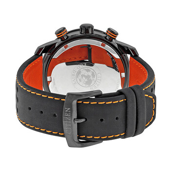 Black PVD stainless steel case with a black polyurethane coated leather strap (with red backing). Uni-directional rotating black PVD bezel. Grey and orange dial with luminous hands and Arabic numeral hour markers. Minute markers. Tachymeter markings around the outer rim. Dial Type: Analog. Luminescent hands and markers. Date display at the 3 o'clock position. Chronograph - three sub-dials displaying: 60 second, 60 minute and 24 hour. Eco-Drive B612 eco-drive movement. Scratch resistant mineral crystal. Solid case back. Case size: 45 mm. Round case shape. Band width: 23 mm. Tang clasp. Water resistant at 100 meters / 330 feet. Functions: chronograph, date, hour, minute, second. Sport watch style. Watch label: Japan Movt. Item Variations: CA0467 11H, CA0467.11H, CA046711H. Citizen Eco Drive Grey Dial Chronograph Men's Watch CA0467-11H.