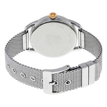 Stainless steel case with a stainless steel mesh bracelet. Fixed stainless steel bezel. Silver dial with luminous rose gold-tone hands and index hour markers. Arabic numerals mark the 6 and 12 o'clock positions. Minute markers around the outer rim. Dial Type: Analog. Date display at the 3 o'clock position. Eco drive quartz movement. Scratch resistant mineral crystal. Pull / push crown. Solid case back. Case size: 34 mm. Case thickness: 8 mm. Round case shape. Band width: 17 mm. Tang clasp. Water resistant at 30 meters / 100 feet. Functions: date, hour, minute, second. Dress watch style. Citizen Eco Drive Ladies Watch FE6081-51A.
