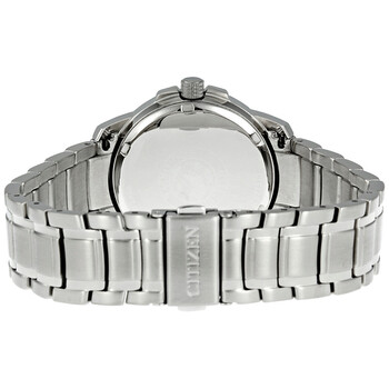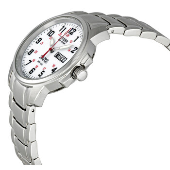 Stainless steel case with a stainless steel bracelet. Fixed stainless steel bezel. White dial with luminous hands and Arabic numeral hour markers. Minute markers around the outer rim. GMT scale. Luminescent hands and markers. Day of the week and date display appears at the 3 o'clock position. Eco drive quartz movement. Scratch resistant mineral crystal. Textured push / pull crown. Solid case back. Case diameter: 38 mm. Case thickness: 9.5 mm. Fold over clasp with push button release. Water resistant at 100 meters / 330 feet. Citizen Eco Drive Railroad Approved Men's Watch BM8180-54A.