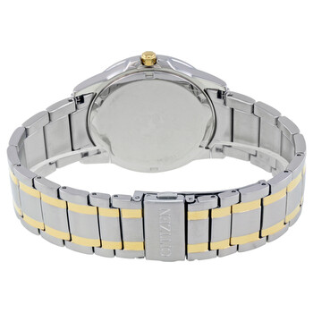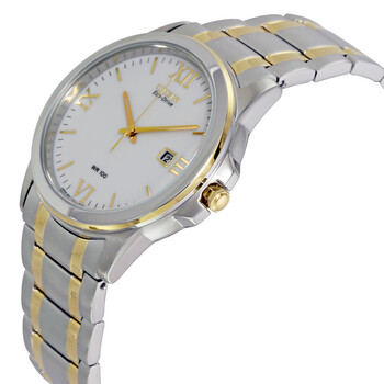 Stainless steel case with a two-tone (silver and gold-tone) stainless steel bracelet. Fixed stainless steel bezel. Silver dial with gold-toned hands and index hour markers. Roman numerals mark the 3, 6, 9 and 12 o'clock positions. Minute markers around the outer rim. Dial Type: Analog. Date display at the 3 o'clock position. Eco-drive movement. Scratch resistant mineral crystal. Solid case back. Case diameter: 40 mm. Case thickness: 8 mm. Round case shape. Fold over clasp. Water resistant at 100 meters / 330 feet. Functions: date, hour, minute, second. Dress watch style. Watch label: Japan Movt. Item Variations: BM7264 51A, BM7264.51A, BM726451A. Citizen Eco Drive Silver Dial Two-tone Stainless Steel Men's Watch BM7264-51A.