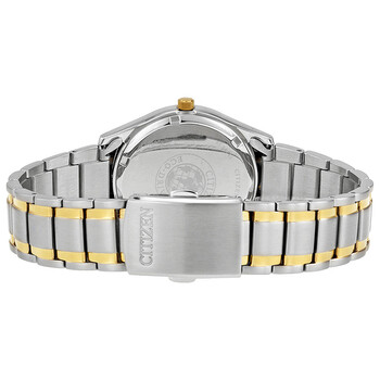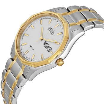 Stainless steel case with a two-tone (silver and yellow gold-tone) stainless steel bracelet. Fixed yellow gold-tone bezel. White dial with luminous yellow gold-tone hands and index hour markers. Minute markers around the outer rim. Dial Type: Analog. Luminescent hands and markers. Day of the week and date display at the 3 o'clock position. Citizen Caliber Eco-Drive E101 eco-drive movement. Scratch resistant mineral crystal. Pull / push crown. Solid case back. Case size: 36 mm. Case thickness: 9.5 mm. Round case shape. Band width: 20 mm. Band length: 7.5 inches. Deployment clasp. Water resistant at 100 meters / 330 feet. Functions: date, day, hour, minute, second. Casual watch style. Watch label: Japan Movt. Item Variations: BM8434 58A, BM8434.58A, BM843458A. Citizen Eco Drive White Dial Two-tone Men's Watch BM8434-58A.