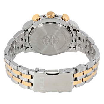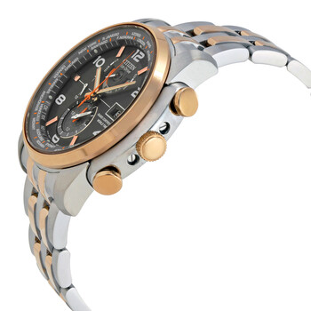 Stainless steel case with a two-tone (silver and rose gold-tone) stainless steel bracelet. Fixed rose gold-tone bezel. Grey dial with luminous rose gold-tone hands and alternating Arabic numeral and index hour markers. Minute markers. World time cities around the outer rim. Dial Type: Analog. Luminescent hands and markers. Date display at the 3 o'clock position. Three displays showing: 24 hour, 24 hour and days of the week. Quartz movement. Scratch resistant sapphire crystal. Pull / push crown. Solid case back. Case diameter: 43 mm. Case thickness: 12 mm. Round case shape. Band width: 22 mm. Band length: 7.5 inches. Fold over clasp with push button release. Water resistant at 200 meters / 660 feet. Functions: date, day, hour, minute, second, world time. Casual watch style. Citizen Eco Drive World Time Grey Dial Two-tone Men's Watch AT9016-56H.