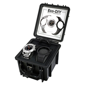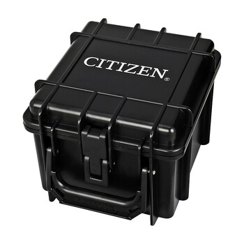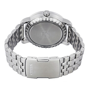 Stainless steel case with a stainless steel bracelet. Fixed stainless steel bezel. Black dial with silver-tone hands and dot hour markers. Minute markers around the outer rim. Dial Type: Analog. Luminescent hands and markers. Date display at the 3 o'clock position. Citizen Caliber Eco-Drive J810 quartz movement. Scratch resistant mineral crystal. Screw down crown. Solid case back. Case size: 46 mm. Case thickness: 13.5 mm. Round case shape. Band width: 21 mm. Fold over clasp with a safety release. Water resistant at 200 meters / 660 feet. Functions: date, hour, minute, second. Sport watch style. Citizen Eco-DIY Men's Watch AW1530-65E.