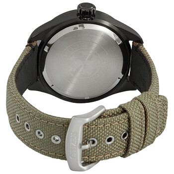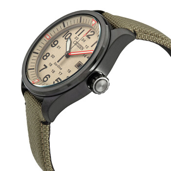 Black stainless steel case with a khaki green nylon strap. Fixed black stainless steel bezel. Beige dial with luminous black and red hands and Arabic numeral hour markers. 24 hour markers. Minute markers around the outer rim. Dial Type: Analog. Luminescent hands and markers. Date display at the 3 o'clock position. Citizen caliber Eco-Drive J810 eco-drive movement. Scratch resistant mineral crystal. Solid case back. Round case shape. Case size: 42 mm. Case thickness: 12.5 mm. Band width: 20 mm. Tang clasp. Water resistant at 100 meters / 330 feet. Functions: date, hour, minute, second, solar-powered. Eco-drive Series. Casual watch style. Watch label: Japan Movt. Citizen Eco-Drive Beige Dial Khaki Green Nylon Men's Watch AW5005-12X.