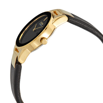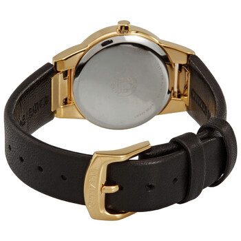 Gold-tone stainless steel case with a black leather strap. Fixed gold-tone bezel with a black ring. Black dial with gold-tone hands. No markers. Dial Type: Analog. Date display at the 3 o'clock position. Citizen caliber J015 eco-drive movement. Scratch resistant mineral crystal. Pull / push crown. Solid case back. Round case shape. Case size: 30 mm. Case thickness: 7 mm. Band width: 16 mm. Tang clasp. Water resistant at 30 meters / 100 feet. Functions: date, hour, minute, second. Eco-drive Series. Casual watch style. Citizen Eco-Drive Black Dial Black Leather Ladies Watch GA1052-04E.