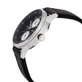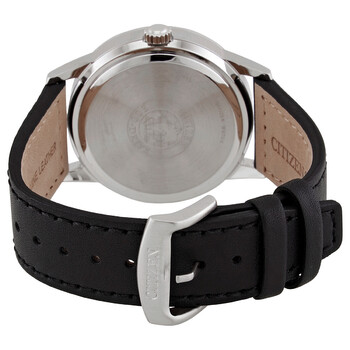 Stainless steel case with a black leather strap. Fixed stainless steel bezel. Black dial with silver-tone hands and index hour markers. Arabic numeral minute markers (at 10 minute intervals). Minute markers around the outer rim. Dial Type: Analog. Two silver sub-dials displaying: 24 hours and date. Citizen caliber 8723 eco-drive movement. Scratch resistant mineral crystal. Solid case back. Round case shape. Case size: 41 mm. Case thickness: 11.5 mm. Band width: 20 mm. Tang clasp. Water resistant at 50 meters / 165 feet. Functions: Date, hour, minute, second. Casual watch style. Watch label: Japan Movt. Citizen Eco-Drive Black Dial Black Leather Men's Watch BU3020-15E.