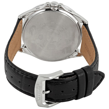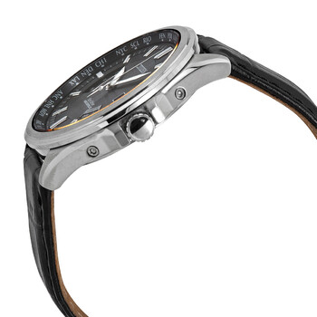 Stainless steel case with a black (calfskin) leather strap. Fixed stainless steel bezel. Black dial with luminous silver-tone hands and index hour markers. Minute markers. world time cities around the outer rim. Dial Type: Analog. Luminescent hands and markers. Perpetual calendar. Date display at the 3 o'clock position, Signal reception indicator. Summer time indicator. Citizen caliber Eco-Drive H145 eco-drive movement. Scratch resistant sapphire crystal. Solid case back. Round case shape. Case size: 44 mm. Case thickness: 11 mm. Band width: 22 mm. Tang clasp. Water resistant at 100 meters / 330 feet. Functions: perpetual calendar, atomic timekeeping, radio controlled, world time, date, GMT, second time zone, hour, minute, second, solar-powered. Travel watch style. Watch label: Japan Movt. Citizen Eco-Drive Black Dial Black Leather Men's Watch CB0011-00E.