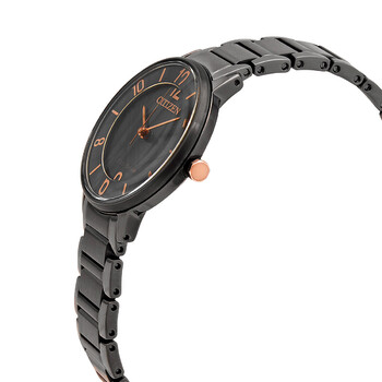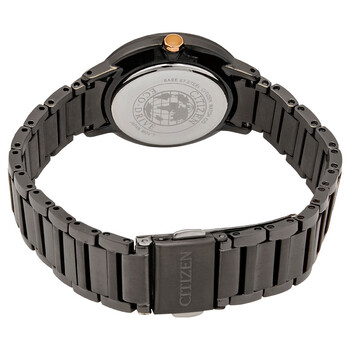 Black-plated stainless steel case and bracelet. Fixed black-plated bezel. Black dial with rose gold-tone hands and alternating Arabic numeral and index hour markers. Dial Type: Analog. Citizen caliber Eco-Drive E031 eco-drive movement. Scratch resistant mineral crystal. Pull / push crown. Solid case back. Round case shape. Case size: 30.8 mm. Case thickness: 9 mm. Band width: 13 mm. Fold over clasp. Water resistant at 50 meters / 165 feet. Functions: hour, minute, second. Eco-drive Series. Casual watch style. Watch label: Japan Movt. Citizen Eco-Drive Black Dial Black-plated Ladies Watch EM0528-82H.