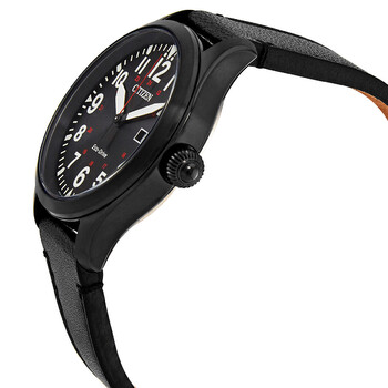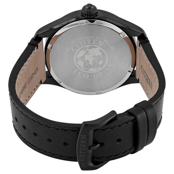 Black-plated stainless steel case with a black leather strap. Fixed black-plated bezel. Black dial with off white hands and Arabic numeral hour markers. 24 hour markers. Minute markers around the outer rim. Dial Type: Analog. Luminescent hands and markers. Date display at the 3 o'clock position. Calibre E111 eco-drive movement. Scratch resistant mineral crystal. Pull / push crown. Solid case back. Round case shape. Case size: 42 mm. Case thickness: 11 mm. Band width: 21 mm. Tang clasp. Water resistant at 100 meters / 330 feet. Functions: date, hour, minute, second. Dress watch style. Watch label: Japan Movt. Citizen Eco-Drive Black Dial Black-plated Men's Watch BM6835-23E.
