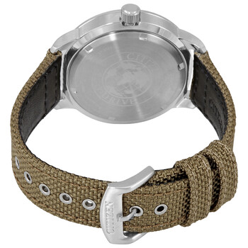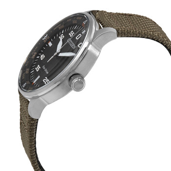 Stainless steel case with a brown (nylon) fabric strap. Fixed stainless steel bezel. Black dial with luminous silver-tone hands and index hour markers. Arabic numeral minute markers (at 5 minute intervals). Minute markers. 360 degree (compass markers) around the outer rim. Dial Type: Analog. Date display at the 3 o'clock position. Caliber eco-drive movement. Scratch resistant mineral crystal. Solid case back. Round case shape. Case size: 42 mm. Case thickness: 11 mm. Band width: 20 mm. Tang clasp. Water resistant at 100 meters / 330 feet. Functions: date, hour, minute, second, compass. Eco-drive Series. Casual watch style. Citizen Eco-Drive Black Dial Brown Fabric Men's Watch BM7390-06E.