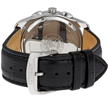 Stainless steel case with a black leather strap. Fixed bezel. Black dial with luminous hands and index hour markers. Tachymeter scale appears around the outer rim. Dial Type: Analog. Date display appears at the 4 o'clock position. Solar powered quartz movement. Scratch resistant mineral crystal. Case diameter: 42 mm. Case thickness: 11 mm. Tang clasp. Water resistant at 100 meters/ 330 feet. Functions: hours, minutes, seconds, date, chronograph, tachymeter. Sport watch style. Citizen Eco-Drive Black Dial Chronograph Men's Watch AT1180-05E.