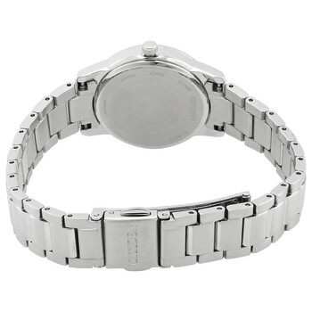 Silver-tone stainless steel case and bracelet. Fixed silver-tone stainless steel bezel. Black dial with silver-tone hands and index-Roman numeral hour markers. Roman numeral marker appears at the 6 and 12 o'clock positions. Minute markers around the outer rim. Dial Type: Analog. Date display at the 3 o'clock position. Citizen Caliber Eco-Drive E011 eco-drive movement. Scratch resistant sapphire crystal. Pull / push crown. Solid case back. Round case shape, case size: 27.5 mm, case thickness: 7.4 mm. Fold over clasp with a safety release. Water resistant at 50 meters / 165 feet. Functions: date, hour, minute, second, solar-powered. Dress watch style. Watch label: Japan Movt. Citizen Eco-Drive Black Dial Ladies Watch EW2318-73E.