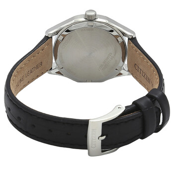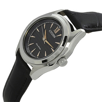 Rose gold-tone stainless steel case with a black leather strap. Fixed silver-tone stainless steel bezel. Black dial with rose gold-tone hands and index-Roman numeral hour markers. Roman numeral marker appears at the 12 o'clock position. Minute markers around the outer rim. Dial Type: Analog. Citizen Caliber Eco-Drive J730 eco-drive movement. Scratch resistant mineral crystal. Pull / push crown. Solid case back. Round case shape, case size: 31.3 mm, case thickness: 8.6 mm. Band width: 16 mm. Buckle clasp. Water resistant at 100 meters / 330 feet. Functions: hour, minute, second, solar-powered. Dress watch style. Watch label: Japan Movt. Citizen Eco-Drive Black Dial Ladies Watch FE2110-14E.