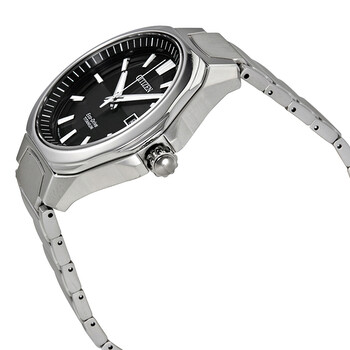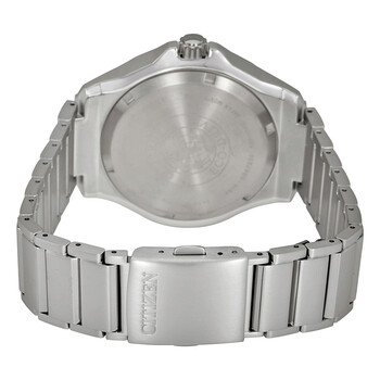 Silver-tone titanium case with a silver-tone titanium bracelet. Fixed silver-tone titanium bezel. Black dial with silver-tone hands and index hour markers. Dial Type: Analog. Date display at the 3 o'clock position. Quartz movement. Scratch resistant sapphire crystal. Solid case back. Case size: 43.5 mm. Round case shape. Fold over with push button clasp. Water resistant at 100 meters / 330 feet. Functions: date, hour, minute, second. Sport watch style. Citizen Eco-Drive Black Dial Men's Titanium Watch AW1540-88E.