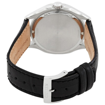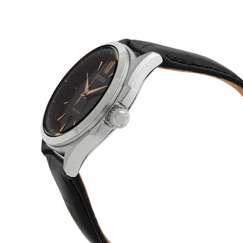 Silver-tone stainless steel case with a black leather strap. Fixed silver-tone stainless steel bezel. Black dial with rose gold-tone hands and index-Roman numeral hour markers. Roman numeral marker appears at the 12 o'clock position. Minute markers around the outer rim. Dial Type: Analog. Date display at the 6 o'clock position. Eco-drive movement. Scratch resistant mineral crystal. Pull / push crown. Solid case back. Round case shape, case size: 41 mm, case thickness: 11 mm. Band width: 22 mm. Tang clasp. Water resistant at 100 meters / 330 feet. Functions: date, hour, minute, second, solar-powered. Casual watch style. Watch label: Japan Movt. Citizen Eco-Drive Black Dial Men's Watch AW1750-18E.