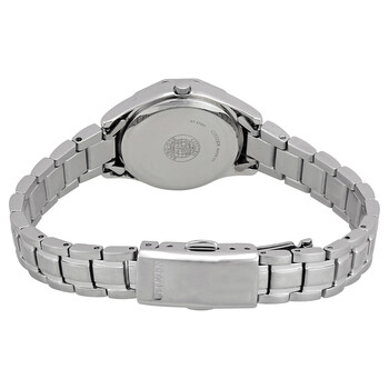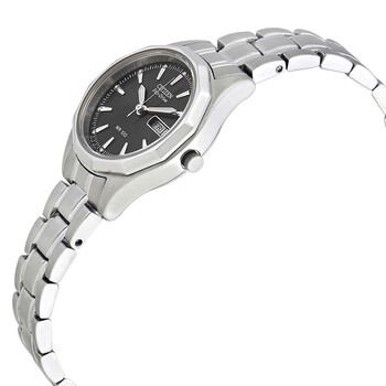 Stainless steel case with a stainless steel bracelet. Fixed stainless steel bezel. Black dial with luminous hands and stick hour markers. Minute markers around the outer rim. Dial Type: Analog. Luminescent hands and markers. Day of the week and date display appear at the 3 o'clock position. Eco-drive movement. Scratch resistant mineral crystal. Pull / push crown. Solid case back. Case size: 26 mm. Case thickness: 8 mm. Round case shape. Band width: 12 mm. Deployment clasp with a push button release. Water resistant at 100 meters / 330 feet. Functions: date, day, hour, minute, second. Casual watch style. Watch label: Made in Japan. Item Variations: EW3140 51E, EW3140.51E, EW314051E. Citizen Eco-Drive Black Dial Stainless Steel Ladies Watch EW3140-51E.