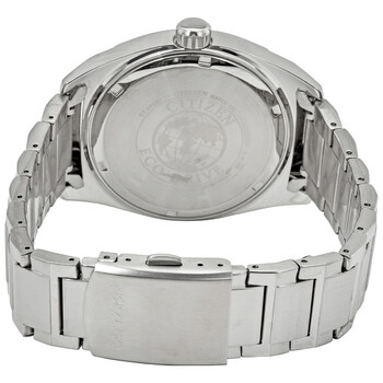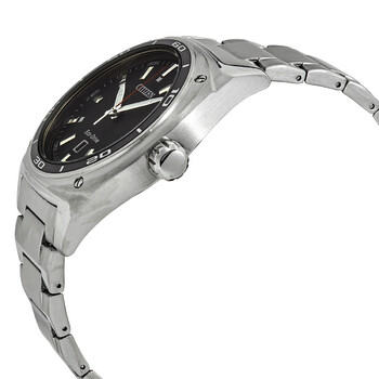 Stainless steel case with a stainless steel bracelet. Fixed stainless steel bezel with a black ring. Black dial with luminous silver-tone hands and index hour markers. Minute markers around the outer rim. Dial Type: Analog. Luminescent hands and markers. Date display above the 6 o'clock position. Eco-drive movement. Scratch resistant mineral crystal. Solid case back. Tonneau case shape. Cclasp ase size: 42 mm. Case thickness: 11 mm. Band width: 22 mm. Fold over clasp with a safety release. Water resistant at 100 meters / 330 feet. Functions: date, hour, minute, second, solar-powered. Casual watch style. Watch label: Japan Movt. Citizen Eco-Drive Black Dial Stainless Steel Men's Watch AW1040-56E.