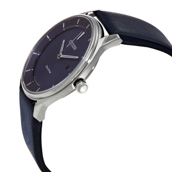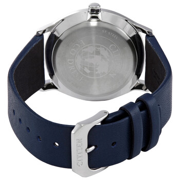 Stainless steel case with a blue leather strap. Fixed stainless steel bezel. Blue dial with silver-tone hands and index hour markers. Dial Type: Analog. Date display at the 3 o'clock position. Citizen caliber E111 eco-drive movement. Scratch resistant mineral crystal. Pull / push crown. Solid case back. Round case shape. Case size: 40 mm. Case thickness: 10 mm. Band width: 20 mm. Tang clasp. Water resistant at 50 meters / 165 feet. Functions: date, hour, minute, second. Dress watch style. Watch label: Japan Movt. Citizen Eco-Drive Blue Dial Blue Leather Men's Watch BM7400-12L.