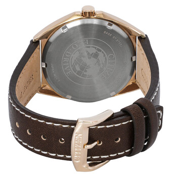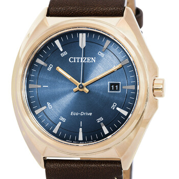 Rose gold-tone stainless steel case with a brown leather strap. Fixed rose gold-tone bezel. Blue dial with luminous rose gold-tone hands and index hour markers. Arabic numeral minute markers (at 5 minute intervals). Minute markers around the outer rim. Dial Type: Analog. Luminescent hands and markers. Date display at the 3 o'clock position. Caliber J810 eco-drive movement. Scratch resistant mineral crystal. Pull / push crown. Solid case back. Round case shape. Case size: 42 mm. Case thickness: 9.8 mm. Band width: 22 mm. Tang clasp. Water resistant at 100 meters / 330 feet. Functions: date, hour, minute, second. Casual watch style. Watch label: Japan Movt. Citizen Eco-Drive Blue Dial Brown Leather Men's Watch AW1573-11L.