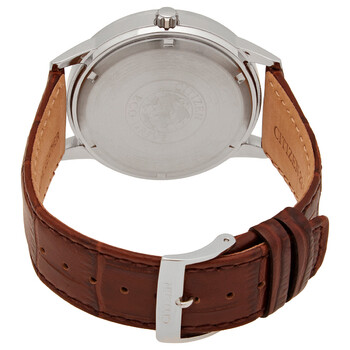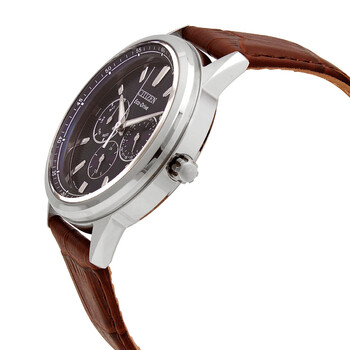Stainless steel case with a brown leather strap. Fixed stainless steel bezel. Blue dial with luminous silver-tone hands and index hour markers. Arabic numeral minute markers (at 5 minute intervals). Minute markers around the outer rim. Dial Type: Analog. Luminescent hands. Three multi-function sub-dials displaying: 24 hours, date and day of the week. Citizen caliber 8729 eco-drive movement. Scratch resistant sapphire crystal. Solid case back. Round case shape. Case size: 44 mm. Case thickness: 13 mm. Band width: 22 mm. Tang clasp. Water resistant at 100 meters / 330 feet. Functions: chronograph, hour, minute, second. Casual watch style. Watch label: Japan Movt. Citizen Eco-Drive Blue Dial Brown Leather Men's Watch BU2071-10L.