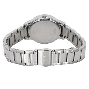 Silver-tone stainless steel case and bracelet. Fixed silver-tone stainless steel bezel. Blue dial with silver-tone hands and index-Roman numeral hour markers. Roman numeral marks the 6 and 12 o'clock positions. Minute markers around the outer rim. Dial Type: Analog. Citizen Caliber Eco-Drive E031 eco-drive movement. Scratch resistant mineral crystal. Pull / push crown. Solid case back. Round case shape, case size: 30.5 mm, case thickness: 8.2 mm. Fold over clasp with a safety release. Water resistant at 50 meters / 165 feet. Functions: hour, minute, second, solar-powered. Dress watch style. Watch label: Japan Movt. Citizen Eco-Drive Blue Dial Ladies Watch EM0899-72L.