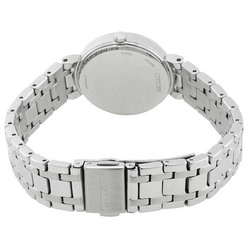 Silver-tone stainless steel case and bracelet. Fixed silver-tone stainless steel bezel. Blue dial with silver-tone hands and alternating Arabic numeral and index hour markers. Minute markers around the outer rim. Dial Type: Analog. Date display at the 3 o'clock position. Citizen Caliber Eco-Drive E011 eco-drive movement. Scratch resistant mineral crystal. Pull / push crown. Solid case back. Round case shape, case size: 28 mm. Fold over clasp with a safety release. Water resistant at 50 meters / 165 feet. Functions: date, hour, minute, second, solar-powered. Dress watch style. Watch label: Japan Movt. Citizen Eco-Drive Blue Dial Ladies Watch EW2690-81L.