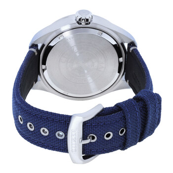 Silver-tone stainless steel case with a blue nylon strap. Fixed silver-tone bezel. Blue dial with black hands and Arabic numeral hour markers. Dial Type: Analog. Date display at the 3 o'clock position. Citizen Caliber J810 eco-drive movement. Scratch resistant mineral crystal. Screw down crown. Solid case back. Round case shape, case size: 42.6 mm, case thickness: 12 mm. Buckle clasp. Water resistant at 100 meters / 330 feet. Functions: date, hour, minute, second. Watch label: Japan Movt. Citizen Blue Dial Men's Watch AW5000-16L.
