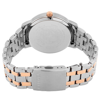 Silver-tone stainless steel case with a two-tone (silver-tone and rose gold ip) stainless steel bracelet. Fixed silver-tone stainless steel bezel. Blue dial with rose gold-tone hands and index hour markers. Minute markers around the outer rim. Dial Type: Analog. Date display at the 3 o'clock position. Citizen Caliber Eco-Drive E111 eco-drive movement. Scratch resistant mineral crystal. Pull / push crown. Solid case back. Round case shape, case size: 40 mm, case thickness: 10 mm. Deployment clasp. Water resistant at 50 meters / 165 feet. Functions: date, hour, minute, second, solar-powered. Dress watch style. Watch label: Japan Movt. Citizen Eco-Drive Blue Dial Men's Watch BM7466-81L.