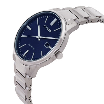 Silver-tone stainless steel case and bracelet. Fixed silver-tone stainless steel bezel. Blue dial with silver-tone hands and index hour markers. Minute markers around the outer rim. Dial Type: Analog. Date display at the 3 o'clock position. Citizen Caliber Eco-Drive E111 eco-drive movement. Scratch resistant sapphire crystal. Pull / push crown. Solid case back. Round case shape, case size: 39.2 mm, case thickness: 9.5 mm. Deployment with push button release clasp. Water resistant at 50 meters / 165 feet. Functions: date, hour, minute, second, solar-powered. Eco-drive Series. Watch label: Japan Movt. Citizen Eco-Drive Blue Dial Men's Watch BM7521-85L.