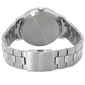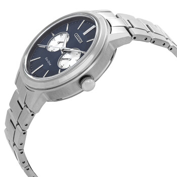Silver-tone stainless steel case and bracelet. Fixed silver-tone stainless steel bezel. Blue dial with silver-tone hands and index hour markers. Minute markers around the outer rim. Dial Type: Analog. Two sub-dials displaying: date and day. Citizen Caliber Eco-Drive 8725 eco-drive movement. Scratch resistant mineral crystal. Solid case back. Round case shape, case size: 41 mm, case thickness: 11.2 mm. Fold over clasp with a safety release. Water resistant at 100 meters / 330 feet. Functions: date, day, hour, minute, second, solar-powered. Dress watch style. Watch label: Japan Movt. Citizen Eco-Drive Blue Dial Men's Watch BU4030-91L.