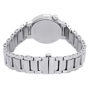 Silver-tone stainless steel case and bracelet. Fixed silver-tone stainless steel bezel. Blue mother of pearl dial with silver-tone hands and dot hour markers. Diamond marker at the 8 o'clock position. Dial Type: Analog. Citizen Caliber Eco-Drive E031 eco-drive movement. Scratch resistant sapphire crystal. Pull / push crown. Solid case back. Round case shape, case size: 30 mm. Deployment clasp. Water resistant at 50 meters / 165 feet. Functions: hour, minute, second, solar-powered. Casual watch style. Watch label: Japan Movt. Citizen Eco-Drive Blue Mother of Pearl Ladies Watch EM0910-80N.