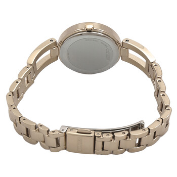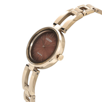 Rose gold-tone stainless steel case and bracelet. Fixed rose gold-tone stainless steel bezel. Brown dial with rose gold-tone hands and index-Roman numeral hour markers. Roman numeral marker appears at the 12 o'clock position. Minute markers around the outer rim. Dial Type: Analog. Citizen Caliber Eco-Drive E013 eco-drive movement. Scratch resistant mineral crystal. Pull / push crown. Solid case back. Round case shape, case size: 28 mm, case thickness: 7.2 mm. Deployment with push button release clasp. Water resistant at 30 meters / 100 feet. Functions: hour, minute, second, solar-powered. Dress watch style. Watch label: Japan Movt. Citizen Eco-Drive Brown Dial Ladies Watch EM0809-83X.