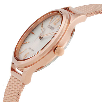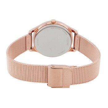Rose gold-tone stainless steel case with a rose gold-tone stainless steel mesh bracelet. Fixed rose gold-tone stainless steel bezel. Champagne dial with rose gold-tone hands and index-Arabic numeral hour markers. Arabic numeral marker appears at the 6 and 12 o'clock positions. Minute markers around the outer rim. Dial Type: Analog. Citizen Caliber Eco-Drive E031 eco-drive movement. Scratch resistant mineral crystal. Pull / push crown. Solid case back. Round case shape, case size: 32 mm, case thickness: 7.3 mm. Water resistant at 50 meters / 165 feet. Functions: hour, minute, second, solar-powered. Dress watch style. Watch label: Japan Movt. Citizen Eco-Drive Champagne Dial Stainless Steel Mesh Ladies Watch EM0508-80X.