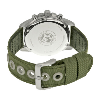 Stainless steel case with a green canvas strap. Fixed stainless steel bezel. Black dial with luminous hands and Arabic numeral hour markers. Minute markers around the outer rim. Date display appears at the 4 o'clock position. Chronograph - three sub-dials displaying: 24 hours, 60 minutes and 60 seconds. Eco-drive movement. Scratch resistant mineral crystal. Solid case back. Case diameter: 41 mm. Case thickness: 11 mm. Tang clasp. Water resistant at 100 meters/ 330 feet. Functions: hours, minutes, seconds, date, chronograph. Citizen Eco-Drive Chronograph Men's Strap Watch AT0200-05E.